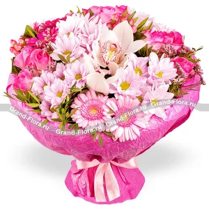 Дыхание марта - коробка с розовыми розами и орхидеей