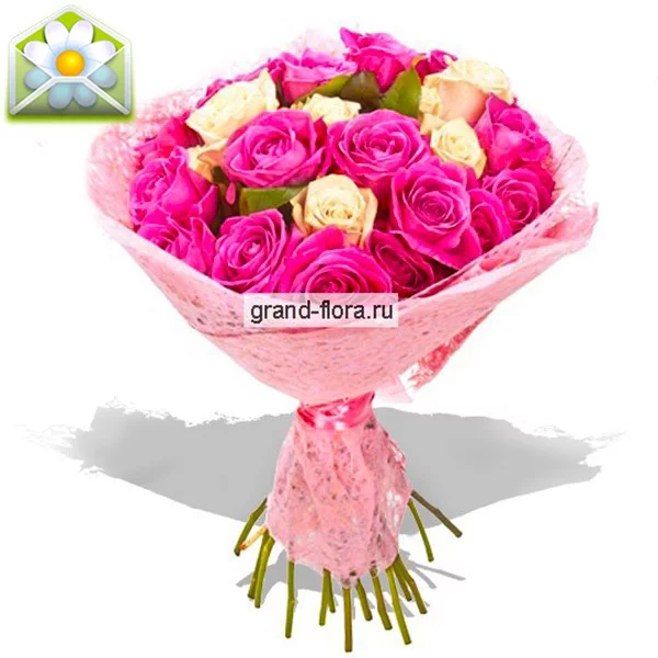 Сочетание белых и розовых роз, в обрамлении нежно-розового фетра, недаром получило название «На крыльях любви». Этот букет кажется невесомым, благодаря нежным цветовым сочетаниям, несколько белых роз застенчиво прячутся в розовых, словно ликующих от восторга цветах. Этот букет дышит искренностью, даря его любимой девушке – Вы восхищаетесь ее красотой и обаянием. Этот букет подойдет и для торжественных моментов и для простого выражения чувств. А добавив к нему шоколад, из нашей сладкой коллекции, Вы доставите двойную радость Вашей избраннице.