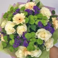 Нежную композицию, составленную из светлых роз и гербер, превосходно подчеркивает кустовая зеленая хризантема. Особое очарование и выразительность придает статица. Яркий фиолетовый букет великолепно подойдет для того, чтобы поздравить коллегу с дня рождения или любым другим торжеством.