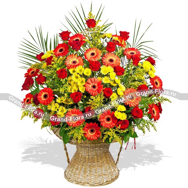 Стандартный (на фото): роза красная - 25 шт., гербера красная - 17 шт., хризантема кустовая желтая - 7 шт., солидаго - 10 шт., лист рабелини - 3 шт., салал, оазис, корзина.