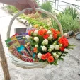 Уменьшенный: роза кустовая (микс) 20 см - 3 шт., конфеты "DOVE Promises" - 1 шт., шоколад "Milka" - 1 шт., Twix - 1 шт., чай "Greenfield" - 1 шт., печенье "Alpen Gold" - 1 шт., декоративная зелень, оазис, корзина средняя.