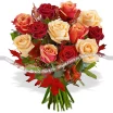 17 роз: роза красная - 7 шт.(70см), роза оранжевая - 5 шт.(70см), роза кремовая - 5 шт.(70см), Декор - осенние листья/ или упаковка.