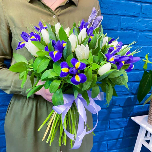 Букет из белых тюльпанов и ирисов – это изысканное сочетание элегантности и утонченности. Белые тюльпаны символизируют чистоту, невинность и искренние чувства, а синие ирисы добавляют композиции глубину и загадочность. Вместе они создают гармоничный дуэт, который станет идеальным подарком для особенного случая или просто приятным сюрпризом для близкого человека. Такой букет наполнит пространство свежестью весеннего утра и подарит ощущение легкости и радости.