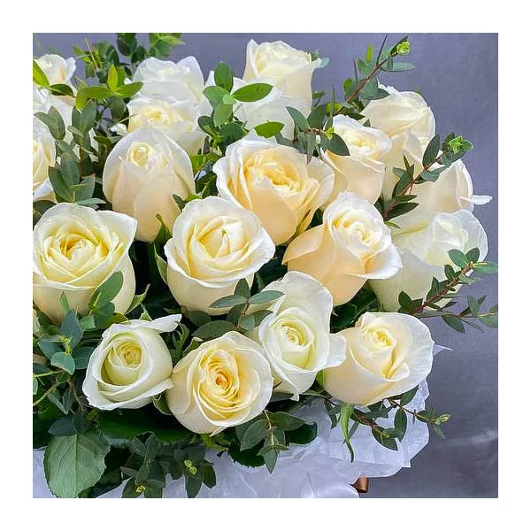 25 роз: роза белая (Россия) 50 см.,- 25 шт., коробка круглая средняя (20*30) - 1 шт., эвкалипт, оазис.
